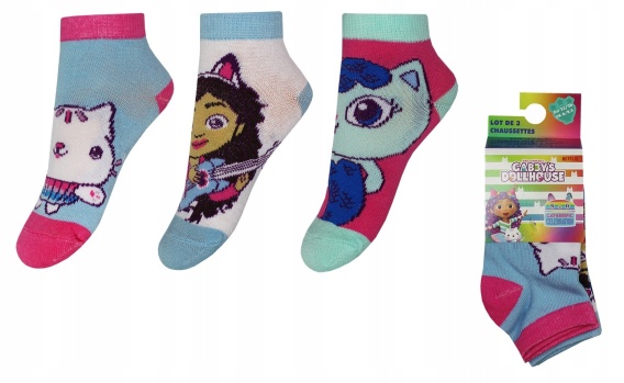 Licencjonowany zestaw trzech par skarpetek dziewczęcych Koci Domek Gabi z kolorowymi nadrukami, wykonany z wysokogatunkowej bawełny. Róż/Niebieski/Niebieski