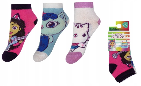 Licencjonowany zestaw trzech par skarpetek dziewczęcych Koci Domek Gabi z kolorowymi nadrukami, wykonany z wysokogatunkowej bawełny. Czarny/Biały/Fiolet
